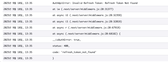 getUser()를 호출하는 API 라우트/레이아웃/다른 서버 코드를 없애거나 뒤로 미루기이 문제의 핵심은 “리프레시 토큰은 단 한 번만 안전하게 쓸 수 있다”**는 사실입니다. **동시에 두 군데에서 getUser()를 호출하면 한쪽은 성공하고, 다른 한쪽은 “Refresh Token Not Found / Already Used”로 실패하면서 사용자가 로그아웃되는 경쟁 조건이 생깁니다.